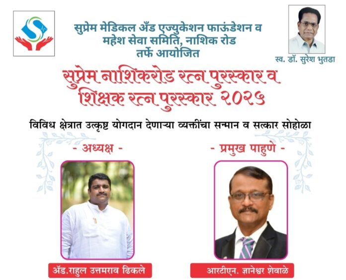 नाशिक रोड येथील सुप्रेम मेडिकल फाउंडेशन आणि रोटरी क्लब नाशिक सुप्रीम तर्फे दरवर्षीप्रमाणे यंदाही ‘नाशिक रोड रत्न पुरस्कार’ प्रदान करण्यात येणार असून, विविध क्षेत्रांत उल्लेखनीय कार्य करणाऱ्या व्यक्तींना या पुरस्काराने गौरविण्यात येणार आहे. याबाबतची माहिती फाउंडेशनचे संस्थापक अध्यक्ष व व्यापारी बँकेचे उपाध्यक्ष डॉ. प्रशांत भुतडा यांनी दिली.