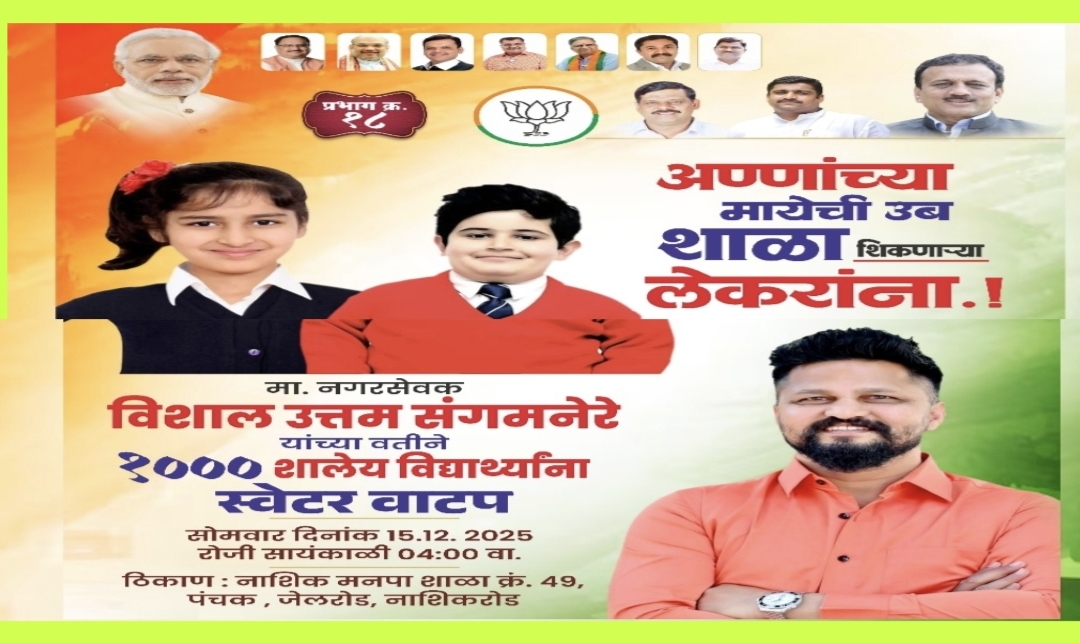 ऐन कडाक्याच्या थंडीत जेलरोड परिसरातील एक हजार शालेय विद्यार्थ्यांना मोफत उबदार स्वेटर मिळणार आहे. पंचक येथील महापालिका शाळेतील विद्यार्थ्यांना याचा लाभ मिळणार आहे. सोमवारी ( दि.१५ ) सायंकाळी चार वाजता मनपा शाळा क्रमांक ४९ येथे माजी नगरसेवक विशाल संगमनेरे यांच्या पुढाकाराने आणि आमदार ॲड राहुल ढिकले यांच्या हस्ते तसेच मान्यवरांच्या उपस्थितीत स्वेटर वाटपाचा कार्यक्रम पार पडणार आहे.
