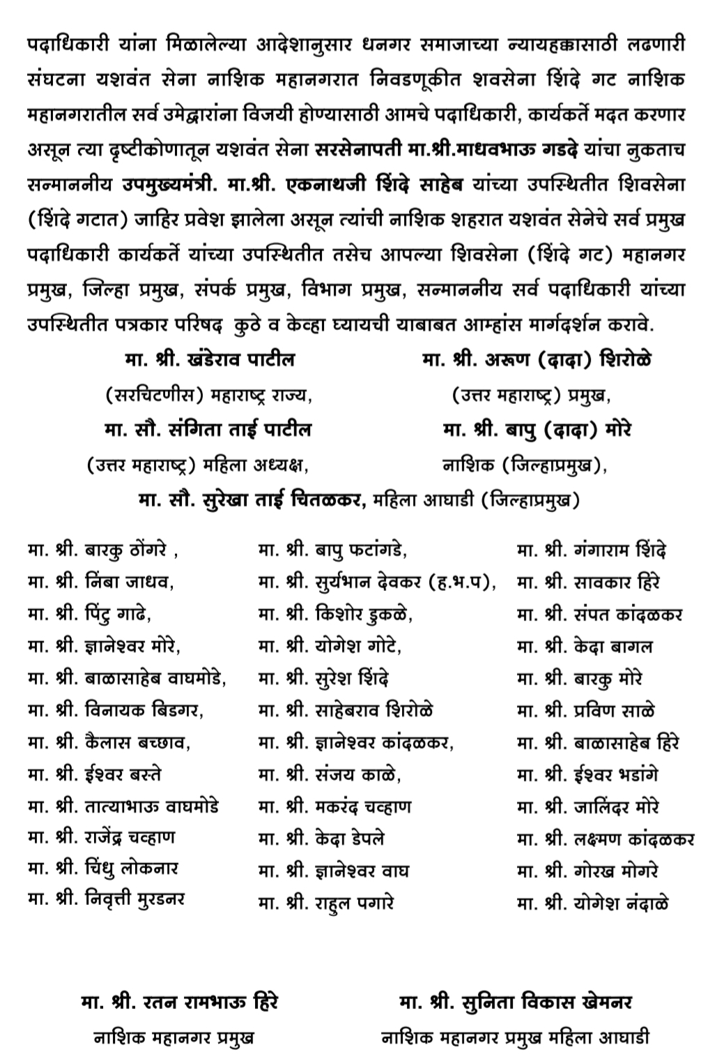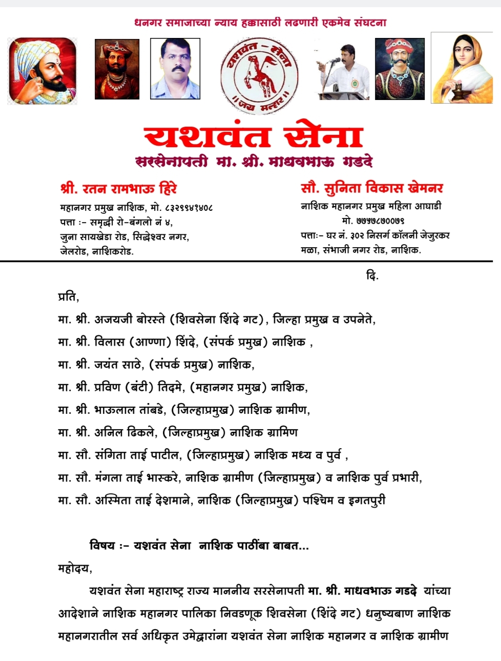 प्रभाग १७ मधील शिवसेना शिंदे गटाच्या अधिकृत उमेदवारांच्या प्रचाराचा शुभारंभ मंत्री दादा भुसे यांच्यासह पदाधिकाऱ्यांच्या उपस्थितीत पार पडला. संपूर्ण महाराष्ट्रात धनगर समाजाच्या बाजूने संघर्ष करून लढा देणाऱ्या यशवंत सेनेचा पदाधिकाऱ्यांनी शिवसेना शिंदे गटात प्रवेश करून महापालिका निवडणुकीत शिवसेनेला पाठिंबा दिला. शहर महानगर प्रमुख रतन हिरे यांनी भुसे यांना पाठिंब्याचे पत्र दिले.