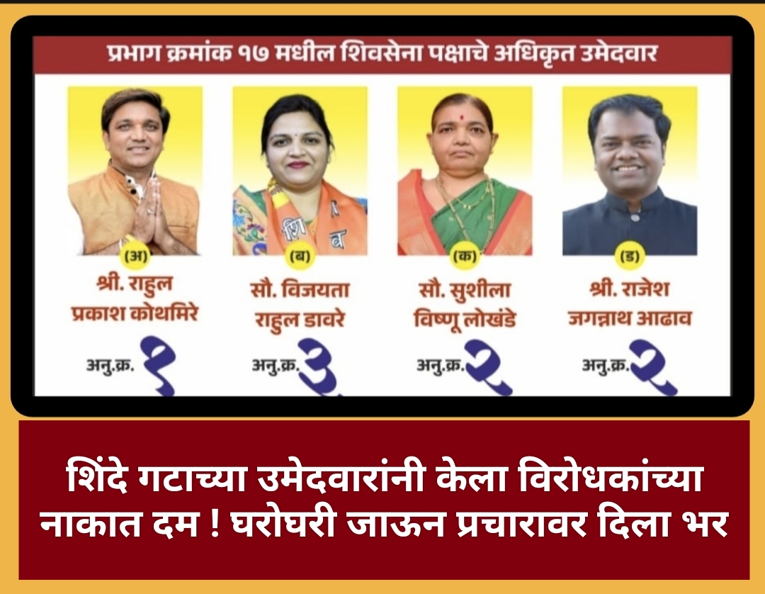 प्रभाग १७ मधील शिंदे गटाचे अधिकृत उमेदवार राजेश आढाव, विजयता डावरे, सुशीला लोखंडे, राहुल कोथमिरे राजकीय दृष्ट्या सुसंकृत उमेदवार म्हणून चर्चेत आहे. त्यांच्या प्रचाराची आणि जनतेसोबत संवाद साधण्याची पद्धत लक्षवेधक ठरताना दिसते. प्रभाग १७ मधील जनता जनार्दन सूज्ञ आणि चणाक्ष आहे. प्रभागात विकास कामे आणि मूलभूत सुविधा पुरविण्याची ताकद केवळ शिवसेना शिंदे गटाच्या उमेदवारांमध्ये आहे. त्यामुळे जनता आमच्या पाठीमागे खंबीरपणे ऊभी राहील. आणि आम्हालाचा विजयी करणार असा आत्मविश्वास शिंदे गटाचे अधिकृत उमेदवार राजेश आढाव, विजयता डावरे, सुशीला लोखंडे, राहुल कोथमिरे यांनी व्यक्त केला आहे.